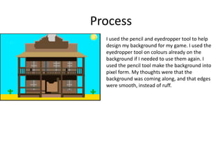 Matthew created a pixel art background and characters for a game using various tools in the software. He used the pencil tool to draw the background, characters, and arms in pixel form. He also used the erase tool and pencil tool to redraw an arm holding a gun. Matthew added a black background and text using the paint bucket and text tools to create a start menu and loading screen with a western theme. He changed the background to black again using the paint bucket tool to represent a change from day to night in the game and add variety.