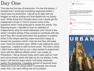 This document summarizes a student's reflections over 16 days of a production project. On the first day, the student organized materials, contacted local shops with questions for an article, and designed a front cover in Photoshop. The next day, the student started an article on the best coffee shops in York while waiting for shop responses. On the third day, the student researched popular places in York for a second article. Over the following days, the student continued writing articles, finding images, and improving layouts.