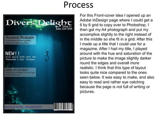 James Gannon created two magazine front covers using a grid layout in Photoshop and InDesign. For the first cover, he placed a photograph at an angle on the grid and added a title. He adjusted the hue and saturation to darken the edges of the image. For the second cover, he used a different main image but kept the same grid layout. He found the first cover with the person in the distance more interesting than the close-up statue shot. The grid layout helped keep the elements neatly spaced and looking professional.