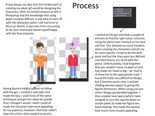 1. Designing the characters by starting with a girl and using different layers, colors, and tools to add details and shading.