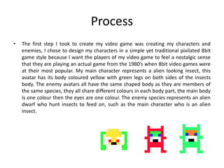 The document summarizes the process Alfie Pimblett took to create their 8-bit style retro video game. They began by designing pixelated characters and enemies. Then, they created the menu screen with a globe and start button. A simple loading screen followed. Next, they designed the first maze level map with controls. A level complete screen was then made. Finally, they animated level 1, added sound effects, and edited the clips together to complete the video game.