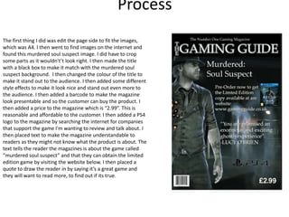 Jack created a magazine cover and spread about the video game "Murdered: Soul Suspect" for a class project. He found images online to use as backgrounds and edited them to fit on the pages. Jack added a title, barcode, price, and other design elements to make the magazine look professional. He used various design tools but found some like the text tool difficult to locate. Jack reviewed his work and felt the text styling could be improved and some elements did not fit well together. He wished he had more time to refine the design further. Overall, Jack was happy with how the background images represented the game but thought the magazine could attract more customers with tweaks to the text styling and layout.