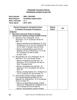 Dokumen ini adalah program tahunan pendidikan agama Islam (PAI) untuk kelas X di SMA 1 Bojong yang menguraikan standar kompetensi, kompetensi dasar, dan indikator pencapaian yang terkait dengan pembelajaran Al-Qur'an dan akhlak. Program ini mencakup pemahaman ayat-ayat Al-Qur'an, meningkatkan keimanan, dan membiasakan perilaku terpuji di kalangan siswa. Metode pembelajaran berupa ceramah, diskusi, dan praktik bertujuan agar siswa dapat mengaplikasikan ajaran Islam dalam kehidupan sehari-hari.
