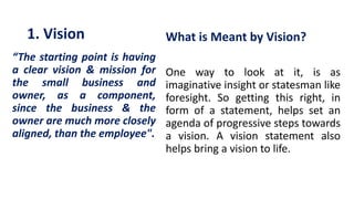This document provides guidance on effective personal development for microbusinesses. It outlines 6 steps: 1) create a vision statement, 2) develop a mission statement, 3) prepare the vision statement, 4) assess your current position, 5) achieve the mission and vision, and 6) decide on development activities. Having clear vision and mission statements helps to inform a personal development plan to drive the business towards its goals. Ongoing learning and development are important to remain competitive and deliver high quality services that help accomplish the business's overriding purpose.