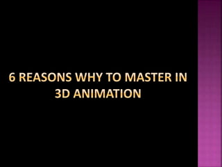 The document discusses 6 reasons to learn 3D animation: 1) To create animated features and characters, 2) For motion picture production where 3D animators take over after storyboards, 3) To create realistic special effects by combining live-action footage with CGI, 4) To design multimedia presentations like eBooks and animated graphics/videos, 5) For game design as game designers master 3D animation tools, and 6) For broadcast production of openings and credits which requires a course in 3D animation broadcast. The document explains that 3D animation is the backbone of major studios and creating believable characters takes both creativity and technical skills that are developed through 3D animation courses.