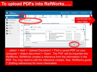 To upload a PDF into RefWorks, select "Add" and "Upload Document" to find and select the PDF from your computer. RefWorks will create a reference using text from the PDF that can be edited. PDFs can also be dragged directly into RefWorks. If a reference already exists for a PDF, the file can be associated by opening the reference and dragging the PDF onto the side panel. Further help is available by contacting a librarian.