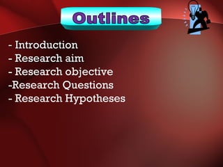 The document discusses research objectives, questions, and hypotheses. It defines the aims, objectives, and importance of properly formulating them. Research objectives should be specific, measurable, achievable, relevant and time-bound. Well-written objectives guide the research process and help evaluate if the study aims were achieved. The document also discusses characteristics of good research questions and hypotheses, and different types of hypotheses like simple vs complex, directional vs non-directional, and null hypotheses.