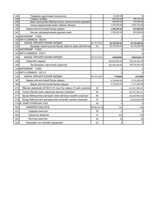 оношлогоо 34,000.00 0 255 Газрын төлбөр 800,000.00 288,764.00 256 Банк санхүүгийн байгууллагын үйлчилгээний хураамж 500,000.00 242,000.00 258 Улсын мэдээллийн маягт хэвлэх, бэлдэх 7,703,600.00 5,007,150.00 259 Бараа үйлчилгээний бусад зардал 1,780,200.00 847,800.00 261 Хичээл үйлдвэрлэлийн дадлага хийх 1,780,200.00 847,800.00 288 ХӨТӨЛБӨР 71602 0 0 289 АРГА ХЭМЖЭЭ 80219 0 0 292 БАРАА ҮЙЛЧИЛГЭЭНИЙ ЗАРДАЛ 14=15+18+21 26,730,000.00 26,730,000.00 332 Бусдаар гүйцэтгүүлсэн бусад нийтлэг ажил үйлчилгээний т35 26,730,000.00 26,730,000.00 452 ХӨТӨЛБӨР 71602 0 0 453 АРГА ХЭМЖЭЭ 81611 0 0 456 БАРАА ҮЙЛЧИЛГЭЭНИЙ ЗАРДАЛ 14=15+18+21 106404000 106356465.4 482 Номативт зардал 106,404,000.00 106,356,465.40 483 Эм бэлдмэл, эмнэлгийн хэрэгсэл 106,404,000.00 106,356,465.40 534 ХӨТӨЛБӨР 71602 0 0 535 АРГА ХЭМЖЭЭ 83112 0 0 538 БАРАА ҮЙЛЧИЛГЭЭНИЙ ЗАРДАЛ 14=15+18+21 4756800 4751000 587 Бараа үйлчилгээний бусад зардал 4,756,800.00 4,751,000.00 588 Бараа үйлчилгээний бусад зардал 4,756,800.00 4,751,000.00 615 Мөнгөн хөрөнгийн 2018-01-01 оны 5-р сарын 31-ний үлдэгдэл 44 0 115,257,385.00 616 Үүнээс банкин дахь харилцах дансны үлдэгдэл 45 0 115,257,385.42 617 Бусад байгууллага иргэдээс авах авлагын эцсийн үлдэгдэл 46 0 (30,204,809.20) 618 Бусад байгууллага иргэдэд өгөх өглөгийн эцсийн үлдэгдэл 47 0 (4,326,695.80) 619 III. БАЙГУУЛЛАГЫН ТОО 48 0 0 620 АЖИЛЛАГСАД БҮГД 49=50+51+52 244 244 621 Удирдах ажилтан 50 6 9 622 Гүйцэтгэх ажилтан 51 203 199 623 Үйлчлэх ажилтан 52 35 36 624 Хүүхдийн тоо /жилийн дунджаар/ 53 0 0