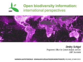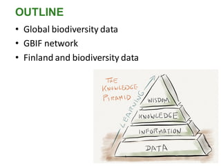 1. The document discusses global biodiversity data sources and uses, highlighting collections, observations, citizen science, and literature. It also reviews organizations that manage and use biodiversity data like GBIF, Catalogue of Life, and Biodiversity Heritage Library.