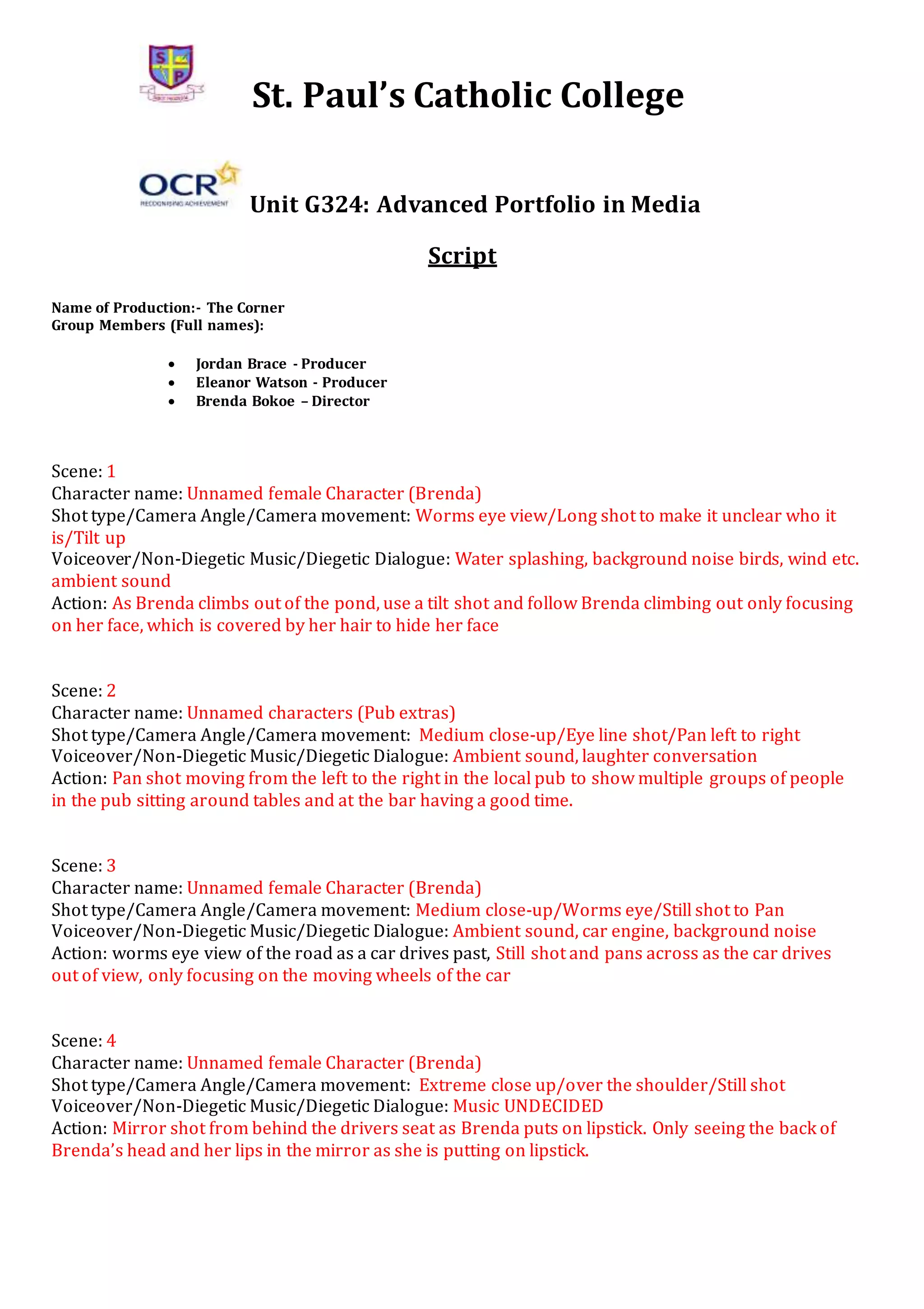 This document contains the script for a film called "The Corner" with 20 scenes. It details the shots, camera movements, dialogue and actions for unnamed main characters Brenda and Liam. The story follows Brenda from climbing out of a pond and getting ready in her car. She arrives at a pub called "The Corner" where inside she pulls out a gun from her bag, pointing it at the pub patrons as Liam enters, trying to stop her. The final scene fades to black on Brenda smiling with a gun in her hand, setting up for ending credits.