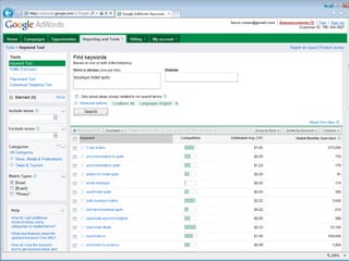 The document discusses Google AdWords, a pay-per-click online advertising platform. It highlights that through AdWords, advertisers can create sponsored listings that appear on Google search results pages and only pay when a user clicks the ad. Advertisers have flexibility to target ads by keywords, location, language and control daily budgets. The document also provides tips for writing effective ads, setting up ad campaigns, and using analytics to optimize campaigns.