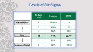 The document discusses Six Sigma, a statistical approach to process improvement. It was developed by Motorola in the 1970s to improve quality by identifying and removing defects. Six Sigma aims to reduce variation and prevent deficiencies through techniques like DMAIC (Define, Measure, Analyze, Improve, Control) and DMADV (Define, Measure, Analyze, Design, Verify). It utilizes belts, champions, masters belts, and executives for implementation. Case studies show how Samsung adopted Six Sigma to remedy defects, reduce costs, improve cycle time, and increase customer satisfaction.