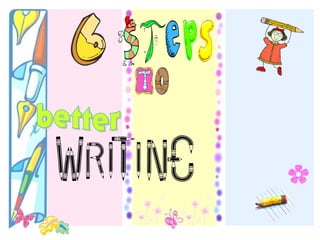 This workshop provides guidance to teachers on improving writing instruction for students. It outlines a six step process to be implemented over six class periods. Each step provides instruction on an element of writing like choosing a title, using a graphic organizer, writing an introduction, body and conclusion, using a checklist to edit and evaluate writing, conducting peer reviews, and using creative exercises like a story pyramid, comic strips and a flip-flop story to practice narrative composition skills. The goal is to equip both teachers and students with strategies for organizing ideas, structuring essays, and workshopping written work.