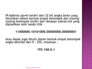IP Address (Ipv4)terdiridari32 bit angkabineryang dituliskandalambentukempatkelompokdanmasing- masingkelompokterdiridaridelapan(oktat) bit yang dipisahkanolehtandatitik