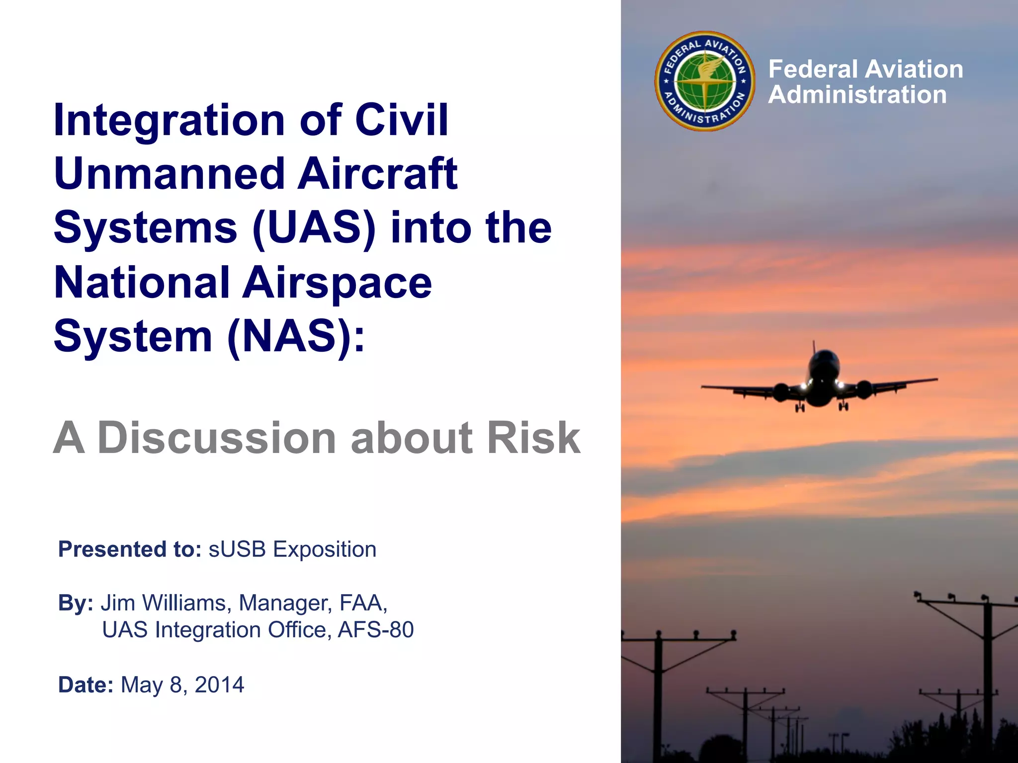 The document summarizes Jim Williams' presentation to the sUSB Exposition on integrating civil unmanned aircraft systems into the national airspace system. It discusses several incidents involving unauthorized or unsafe drone operations that endangered manned aircraft or people. It also reviews FAA regulations on right of way and see and avoid principles. Finally, it outlines the FAA's efforts to develop rules for commercial drone use and addresses the Raphael Pirker case.