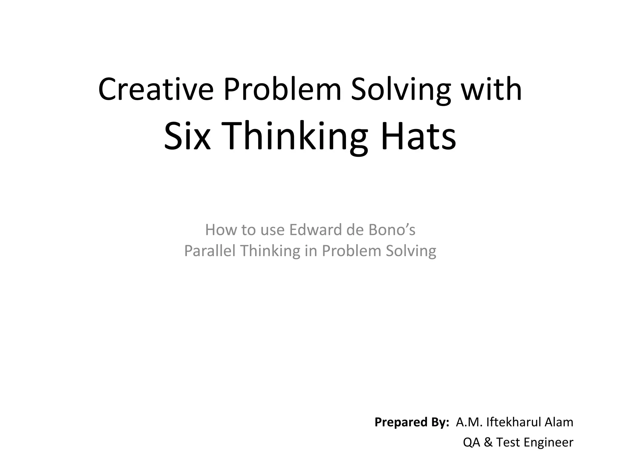 The document introduces Edward de Bono's method of parallel thinking using six colored thinking hats. Each hat represents a different perspective or thought process: white for objective facts, red for emotions, black for caution, yellow for benefits, green for creative ideas, and blue for organization and control. The six hats method structures group discussions to consider an issue from different angles in a set sequence, allowing for a more comprehensive analysis that incorporates logic, creativity, and feelings. Applying the hats helps remove ego and confrontation from problem solving so groups can effectively generate, evaluate, and implement solutions.