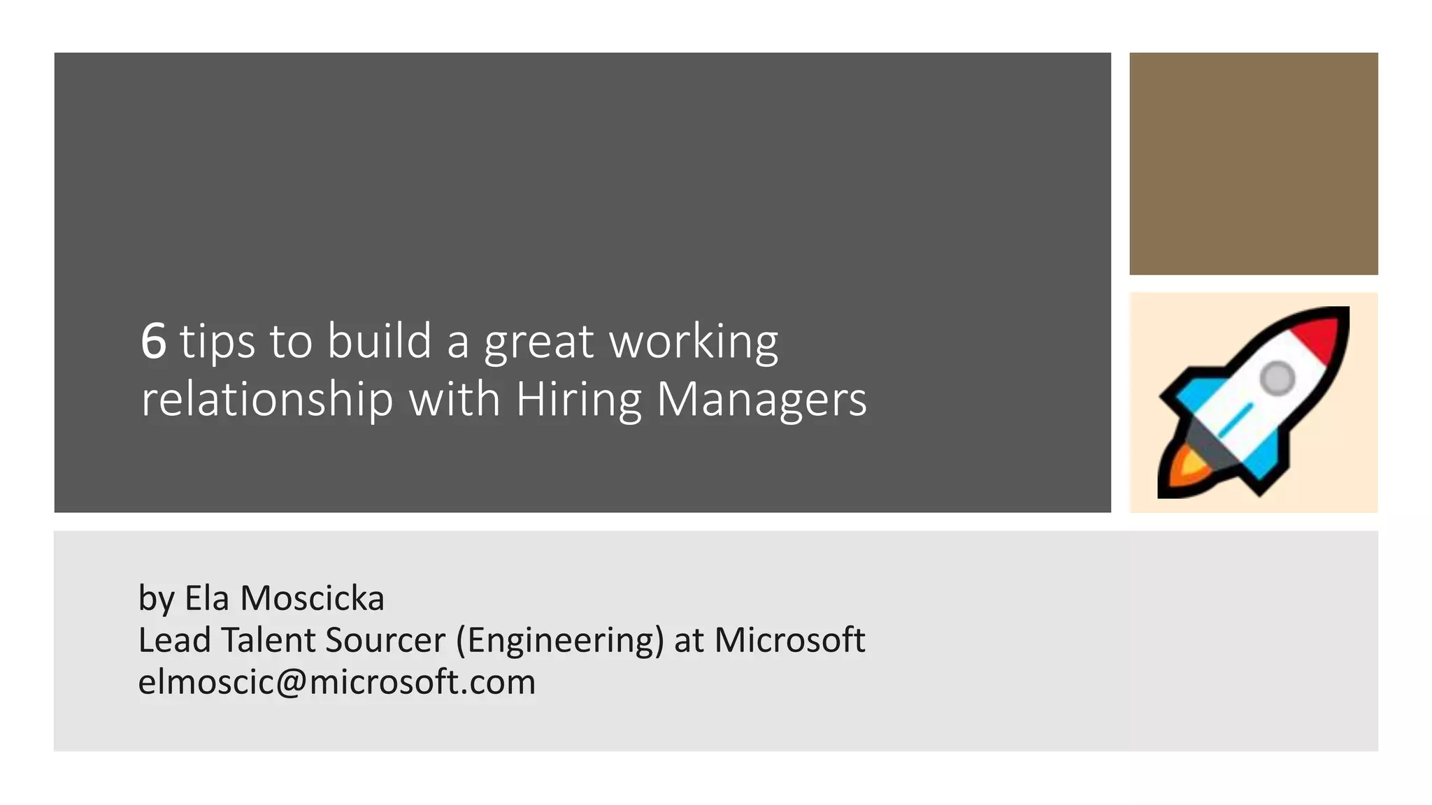 This document provides 6 tips for building a great working relationship with hiring managers. The tips include: 1) Introducing yourself and setting expectations on the recruitment process and timeline; 2) Coming prepared with questions about the role and technology; 3) Agreeing on regular follow-ups, especially in the beginning, to stay up-to-date; 4) Understanding recruitment is a partnership and asking hiring managers for help if needed; 5) Ways hiring managers can help, like sharing about the team online, reaching out to candidates, and brainstorming with recruiters; and 6) Contact information for the author.