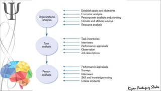 This document discusses training and provides information on various aspects of developing and implementing training programs. It defines training and explains why training is needed. It also outlines different training methods that can be used, such as instructor-led classroom training, e-learning, hands-on training, and simulations. The document discusses evaluating training programs to assess their effectiveness and determine areas for improvement. The evaluation should happen at three levels: through immediate feedback, post-training tests, and post-training appraisals.