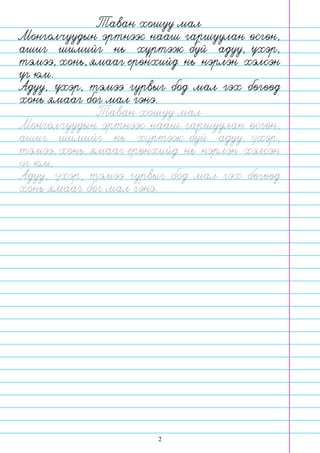 байна. Булаг усан бургилсан сайхан нутаг байна. Оохгуй махыг борог мах гэнэ. Матмал нэгэн цагариг, махир зургаан хавирга тэр юу вэ? Уурга барьсан морьтой залуус давхина. Ондогний шар нь уураг юм. Цан чаргаар гулгана. Цана хэнгэрэг нь лам нарын хэрэглэл билээ. Шударга зан бол хуний нандин чанар юм. Туувэр огуулбэрууд
