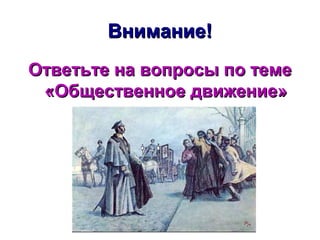 Документ обсуждает общественное движение в России во второй половине XIX века, включая либерализм и консерватизм, а также основные идеи и события того времени. Он содержит вопросы и ответы о ключевых фигурах, течениях и идеях, связанных с революционным и народническим движениями, а также значимые события, такие как убийство императора Александра III. Документ служит учебным материалом для изучения исторического контекста и политических идеологий того периода.