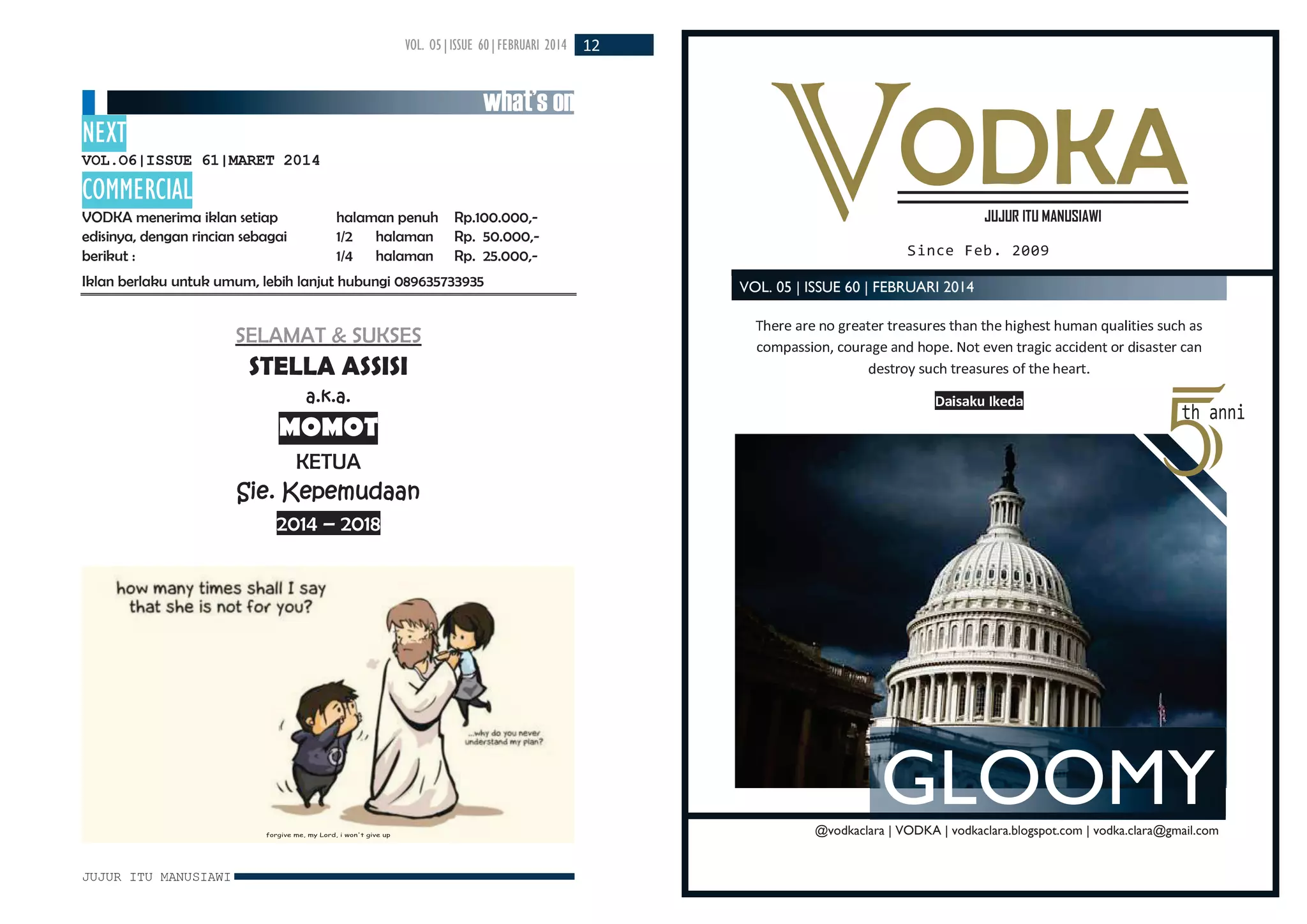 Dokumen tersebut merupakan edisi ke-5 dari majalah Vodka yang membahas tentang bagaimana banjir dapat membawa rezeki. Banjir sering dianggap sebagai bencana, namun dapat menginspirasi karya seni dan kreativitas. Dokumen ini juga membahas tentang pertemuan organisasi kepemudaan dan ulang tahun majalah Vodka yang ke-5.