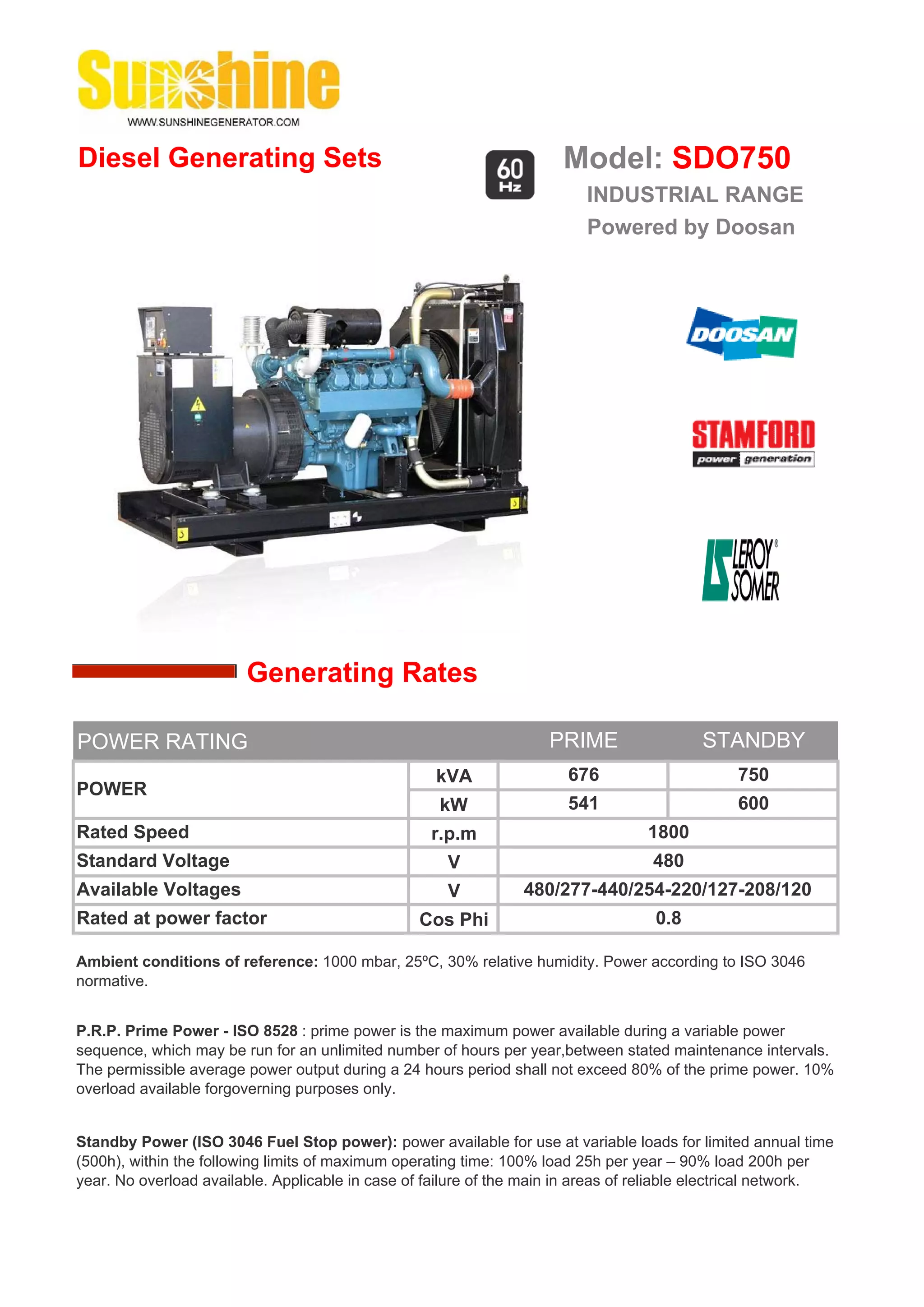 This document provides specifications for a 750 kVA diesel generator set made by Fuzhou Sunshine Machinery. The generator set has a prime power rating of 676 kVA and standby power rating of 750 kVA. It is powered by a Doosan P222LE diesel engine that produces 591 kW of prime power. The generator set also includes a Leroy Somer LSA47.2L9 or Stamford HCI544E alternator, ComAp AMF20 control panel, and standard features like an automatic start system and integrated steel base tank. Optional features include a soundproof canopy.
