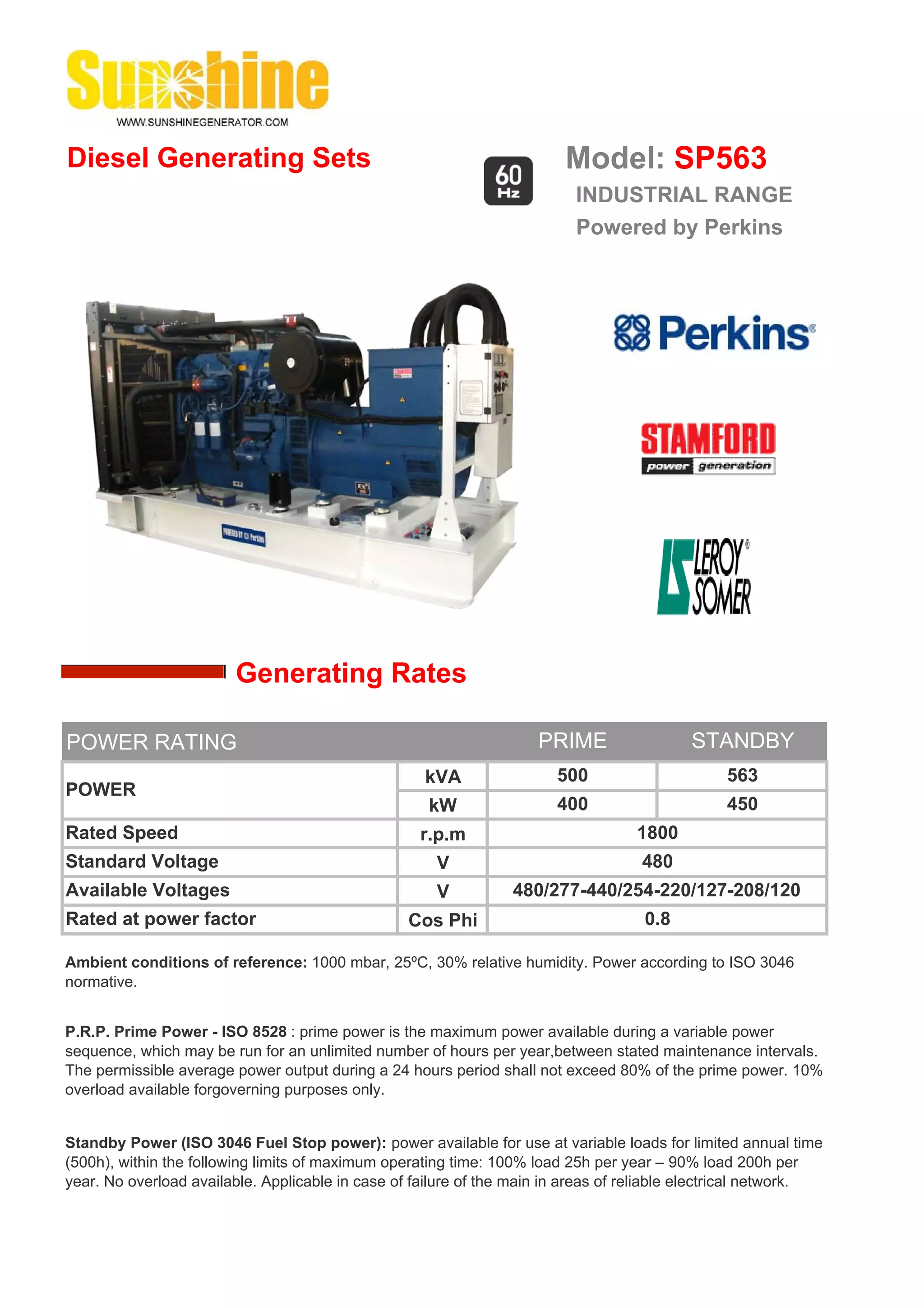 This document provides specifications for a diesel generator set model SP563 powered by a Perkins engine. It can generate 500 kVA of prime power or 563 kVA of standby power. The generator set includes a 4-cycle, 6-cylinder inline diesel engine that produces 435 kW of prime power. Additional details are provided on the alternator, control panel, soundproofing features, and standard generator set components. Dimensions and weights are listed for open and soundproofed versions.