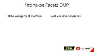 Документ описывает платформу управления данными Facetz DMP, которая обрабатывает 600 миллионов пользователей в реальном времени. Основное внимание уделяется горизонтальной масштабируемости, скорости реакции на события и удобству мониторинга. Также обсуждаются технологии, такие как HBase и Kafka, используемые для обработки и хранения данных.