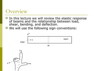 This document reviews beam theory and provides an example of calculating shear force and bending moment diagrams for a beam with various loads applied. The example beam is loaded with a uniform distributed load, two concentrated loads, and supported with two reactions. Free body diagrams are drawn and the reactions are calculated. Then, the shear force and bending moment are calculated as functions of position along the beam based on the loads and reactions. Shear and bending moment diagrams are drawn to visualize how the values change along the length of the beam.