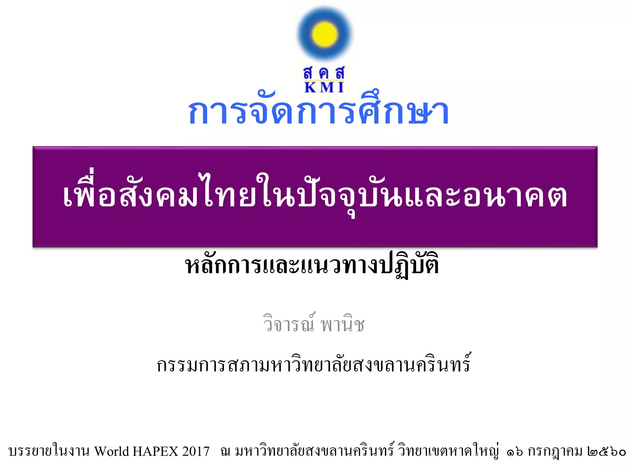“ทิศทางการจัดการศึกษาที่ตอบโจทย์สังคมไทยในปัจจุบันและอนาคต และแนวทางปฏิบัติ” บรรยาย โดย ศ.นพ.วิจารณ์ พานิช บรรยาย ในงาน แสดงสินค้าและประชุมสัมมนานานาชาติ ด้านฮาลาล 2560 (World HAPEX 2017) ระหว่างวันที่ ๑๓ - ๑๖ กรกฎาคม ๒๕๖๐ ณ ศูนย์ประชุมนานาชาติ ฉลองสิริราชสมบัติครบ ๖๐ ปี มหาวิทยาลัยสงขลานครินทร์ วิทยาเขตหาดใหญ่ จัดโดย สถาบันฮาลาล มหาวิทยาลัยสงขลานครินทร์