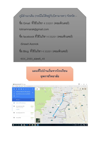 – ชื่อ Gmail ที่ใช้ในวิชำ ง 33201 (คอมพิวเตอร์) lolinamnarak@gmail.com ชื่อ facebook ที่ใช้ในวิชำ ง 33201 (คอมพิวเตอร์) -Sirawit Aoonok ชื่อ Blog ที่ใช้ในวิชำ ง 33201 (คอมพิวเตอร์) -604_2560_siawit_48 ชื่อ Slideshare ที่ใช้ในวิชำ ง 33201 (คอมพิวเตอร์) sirawitaoonokแผนที่ไปบ้ำนเริ่มจำกโรงเรียน ยุพรำชวิทยำลัย