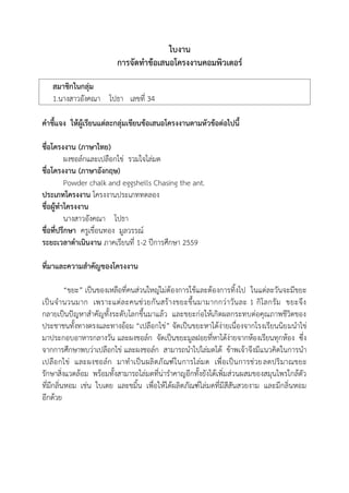 34 คาชี้แจง ให้ผู้เรียนแต่ละกลุ่มเขียนข้อเสนอโครงงานตามหัวข้อต่อไปนี้ ชื่อโครงงาน (ภาษาไทย) ผงชอล์กและเปลือกไข่ รวมใจไล่มด ชื่อโครงงาน (ภาษาอังกฤษ) Powder chalk and eggshells Chasing the ant. ประเภทโครงงาน โครงงานประเภททดลอง ชื่อผู้ทาโครงงาน นางสาวอังคณา โปธา ชื่อที่ปรึกษา ครูเขื่อนทอง มูลวรรณ์ ระยะเวลาดาเนินงาน ภาคเรียนที่ 1-2 ปีการศึกษา 2559 ที่มาและความสาคัญของโครงงาน “ขยะ” เป็นของเหลือที่คนส่วนใหญ่ไม่ต้องการใช้และต้องการทิ้งไป ในแต่ละวันจะมีขยะ เป็นจานวนมาก เพราะแต่ละคนช่วยกันสร้างขยะขึ้นมามากกว่าวันละ 1 กิโลกรัม ขยะจึง กลายเป็นปัญหาสาคัญทั้งระดับโลกขึ้นมาแล้ว และขยะก่อให้เกิดผลกระทบต่อคุณภาพชีวิตของ ประชาชนทั้งทางตรงและทางอ้อม “เปลือกไข่” จัดเป็นขยะหาได้ง่ายเนื่องจากโรงเรียนนิยมนาไข่ มาประกอบอาหารกลางวัน และผงชอล์ก จัดเป็นขยะมูลฝอยที่หาได้ง่ายจากห้องเรียนทุกห้อง ซึ่ง จากการศึกษาพบว่าเปลือกไข่ และผงชอล์ก สามารถนาไปไล่มดได้ ข้าพเจ้าจึงมีแนวคิดในการนา เปลือกไข่ และผงชอล์ก มาทาเป็นผลิตภัณฑ์ในการไล่มด เพื่อเป็นการช่วยลดปริมาณขยะ รักษาสิ่งแวดล้อม พร้อมทั้งสามารถไล่มดที่น่าราคาญอีกทั้งยังได้เพิ่มส่วนผสมของสมุนไพรใกล้ตัว ที่มีกลิ่นหอม เช่น ใบเตย และขมิ้น เพื่อให้ได้ผลิตภัณฑ์ไล่มดที่มีสีสันสวยงาม และมีกลิ่นหอม อีกด้วย