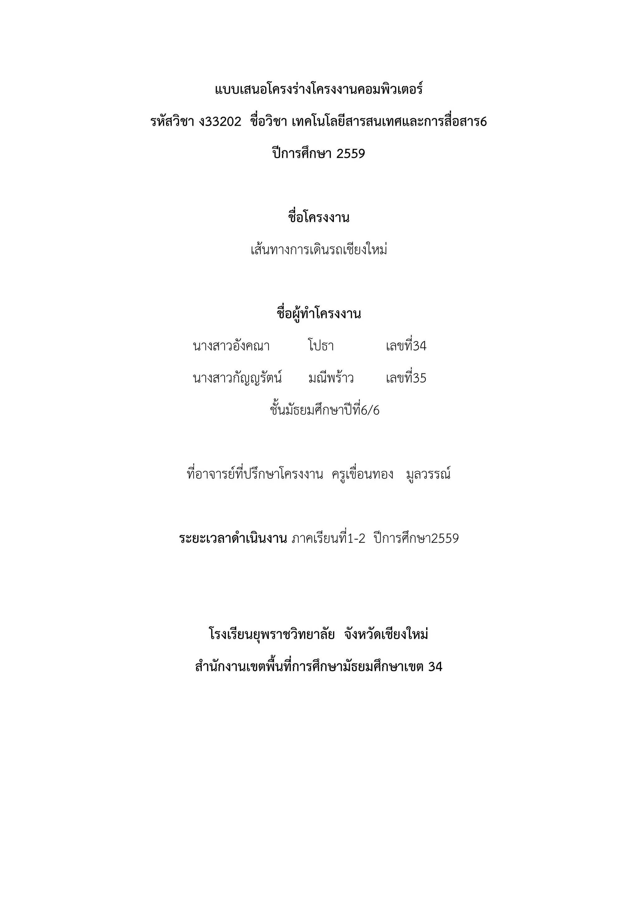 เทคโนโลยีสารสนเทศและการสื่อสาร6 ปีการศึกษา 2559 ชื่อโครงงาน เส้นทางการเดินรถเชียงใหม่ ชื่อผู้ทาโครงงาน นางสาวอังคณา โปธา เลขที่34 นางสาวกัญญรัตน์ มณีพร้าว เลขที่35 ชั้นมัธยมศึกษาปีที่6/6 ที่อาจารย์ที่ปรึกษาโครงงาน ครูเขื่อนทอง มูลวรรณ์ ระยะเวลาดาเนินงาน ภาคเรียนที่1-2 ปีการศึกษา2559 โรงเรียนยุพราชวิทยาลัย จังหวัดเชียงใหม่ สานักงานเขตพื้นที่การศึกษามัธยมศึกษาเขต 34
