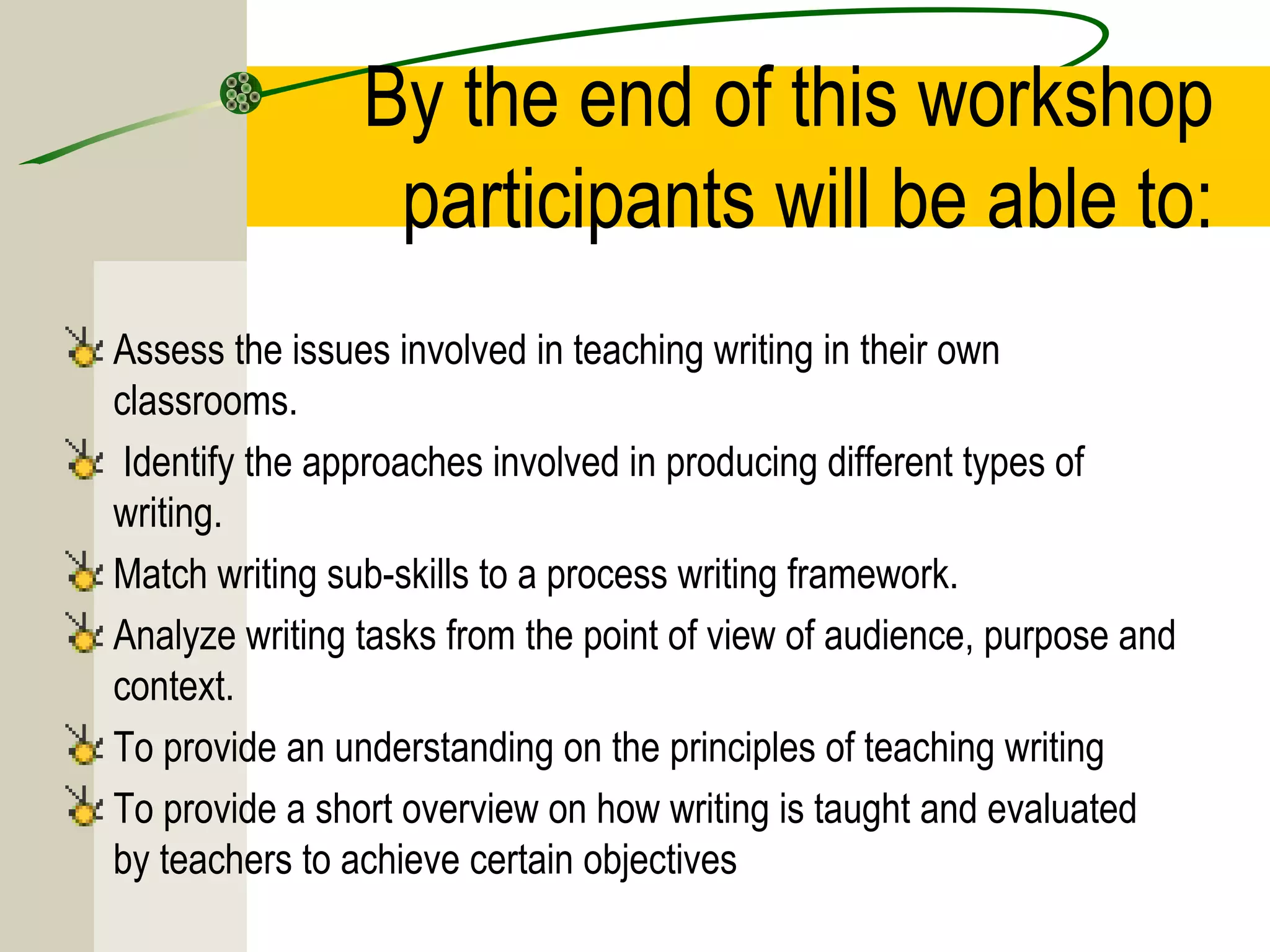 This document provides an overview of teaching writing to L2 learners. It discusses writing as a skill and different types of writing. The document outlines the principles of a process writing approach which includes pre-writing, drafting, editing, and publishing. It also discusses how to evaluate student writing using categories like content, organization, discourse, syntax, vocabulary, and mechanics. Weighting different categories is suggested, with more weight given to content and organization. Specific feedback is emphasized as the most helpful for students.