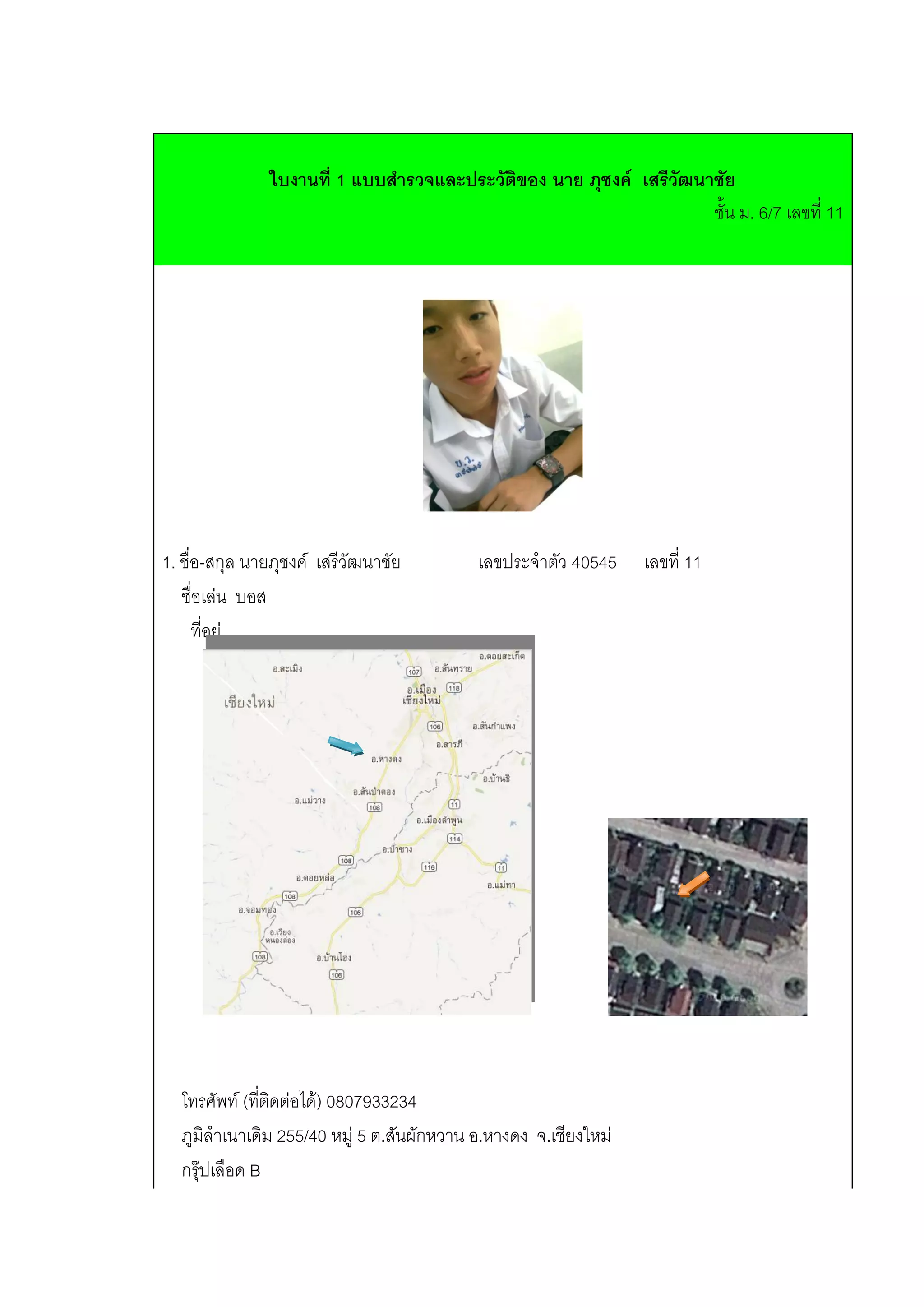 นาย ภุชงค์ เสรีวัฒนาชัย ชั้น ม. 6/7 เลขที่ 11 1. ชื่อ-สกุล นายภุชงค์ เสรีวัฒนาชัย เลขประจาตัว 40545 เลขที่ 11 ชื่อเล่น บอส ที่อยู่ โทรศัพท์ (ที่ติดต่อได้) 0807933234 ภูมิลาเนาเดิม 255/40 หมู่ 5 ต.สันผักหวาน อ.หางดง จ.เชียงใหม่ กรุ๊ปเลือด B