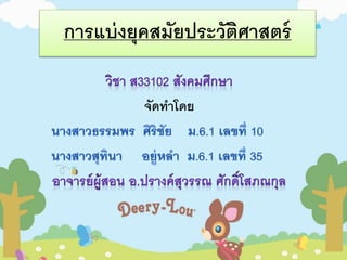 การแบ่งยุคสมัยประวัติศาสตร์ วิชา ส33102 สังคมศึกษา จัดทำโดย นางสาวธรรมพร ศิริชัย ม.6.1 เลขที่ 10 นางสาวสุทินา อยู่หลำ ม.6.1 เลขที่ 35 อาจารย์ผู้สอน อ.ปรางค์สุวรรณ ศักดิ์โสภณกุล