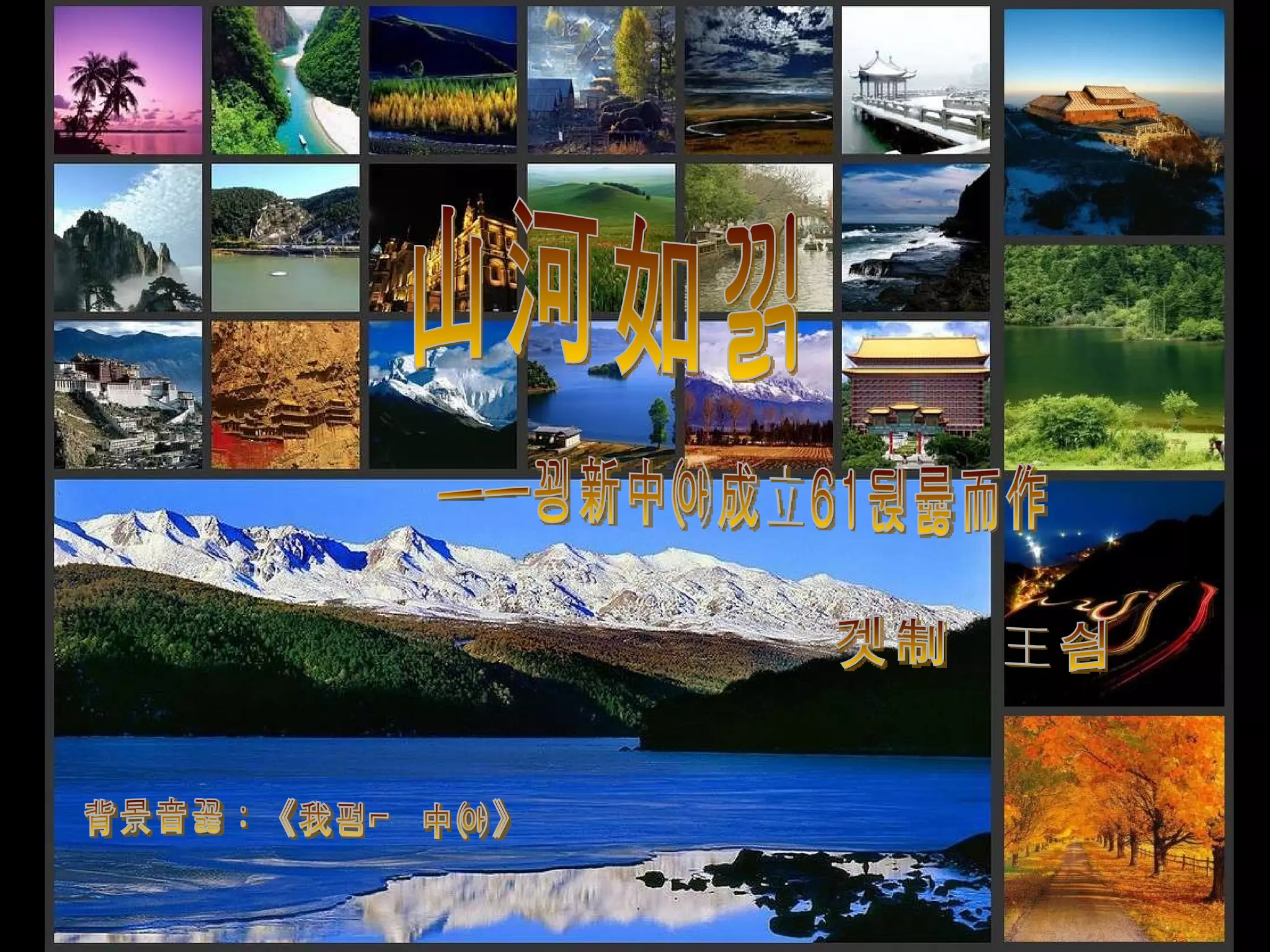 这是一篇为新中国成立61周年创作的文档,描绘了中国众多著名风景名胜和城市。文档结合了背景音乐以强调对祖国的祝福和美好愿景。它展示了中国的自然与人文景观,体现了对未来的期待。