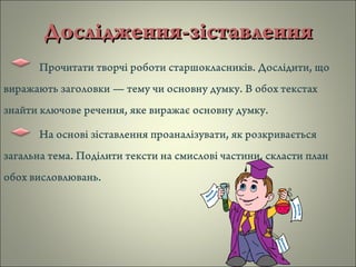 Прочитати творчі роботистаршокласників. Дослідити, що