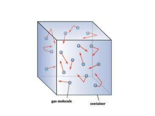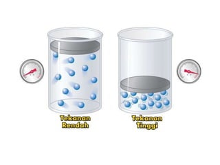 Dokumen ini membahas tentang sifat dan teori kinetik gas, termasuk konsep tekanan udara, pergerakan zarah gas, dan hubungan antara suhu, tekanan, dan isi padu. Teori kinetik gas menyatakan bahawa gas terdiri daripada zarah-zarah kecil yang bergerak secara rawak dan bertumbukan dengan dinding bekas. Penjelasan mengenai pernyataan yang benar dan salah terkait sifat gas juga disertakan.
