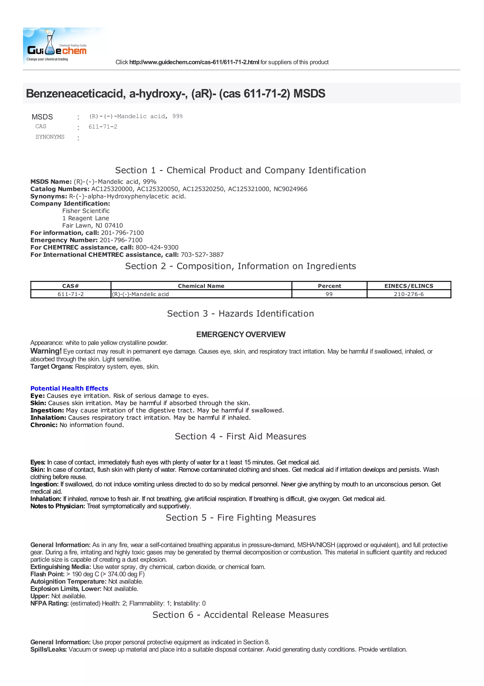 This document summarizes information about (R)-(-)-Mandelic acid including its suppliers, synonyms, hazards, first aid measures, fire fighting measures, accidental release measures, handling and storage, exposure controls, physical/chemical properties, stability and reactivity, toxicological information, ecological information, disposal considerations, transport information, and regulatory information.