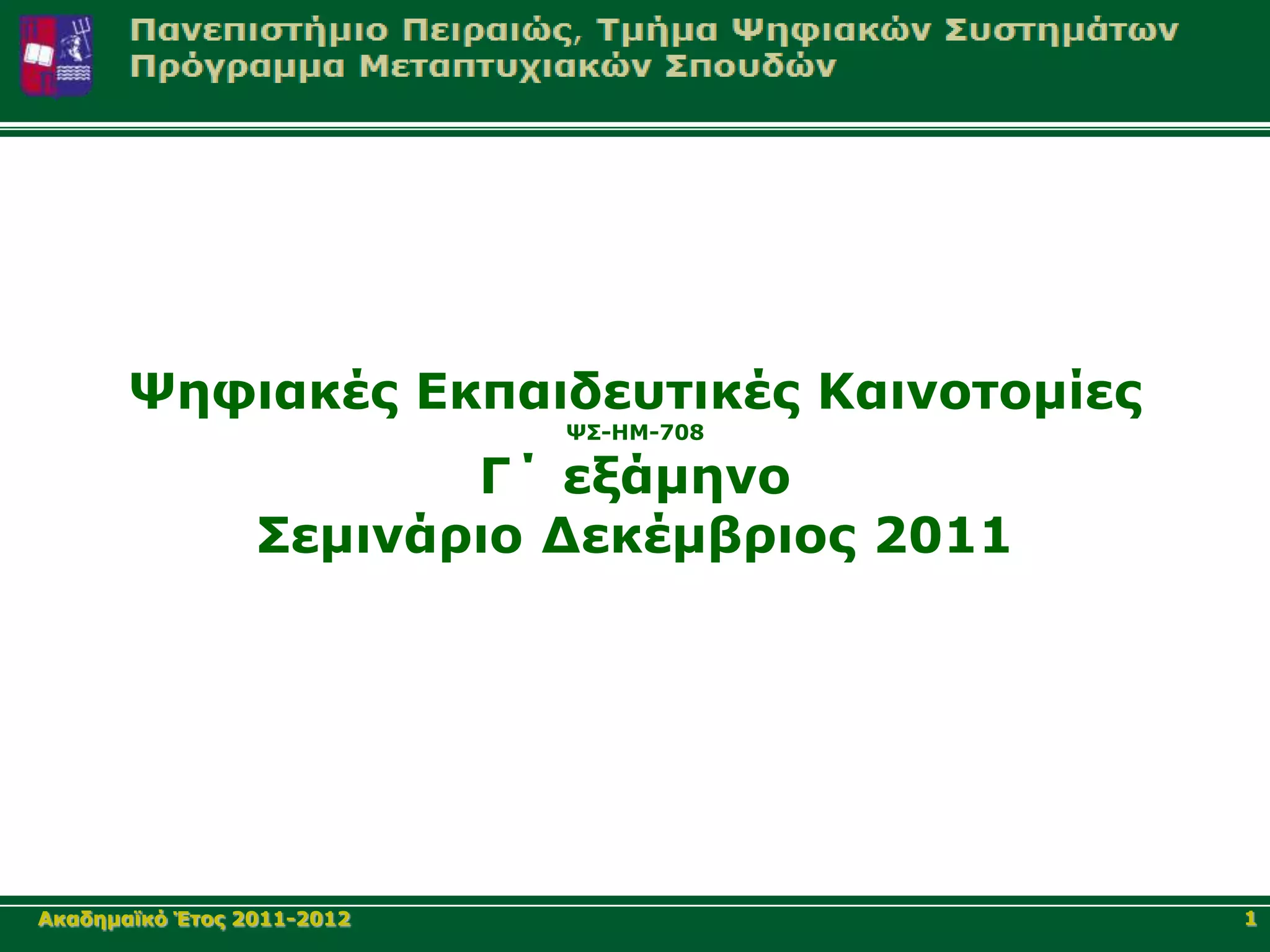 Σεμινάριακό μάθημα που πραγματοποιήθηκε στους φοιτητές Γ΄εξαμήνου (Φηφιακές εκπαιδευτικές καινοτομίες ΨΕΚ_ΗΜ) του μεταπτυχιακού προγράμματος κατευθυνση elearning του τμηματος Ψηφιακών Συστημάτων του πανεπιστημίου Πειραιά