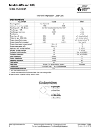 This document provides information on Tedea-Huntleigh models 615 and 616 tension compression load cells. The load cells have capacities ranging from 50-1000 kg, are constructed of nickel-plated steel or stainless steel, and have IP67 protection. They can be used in tension or compression applications and have a 6-wire circuit. The document includes specifications, dimensions, and wiring diagrams for the load cells.