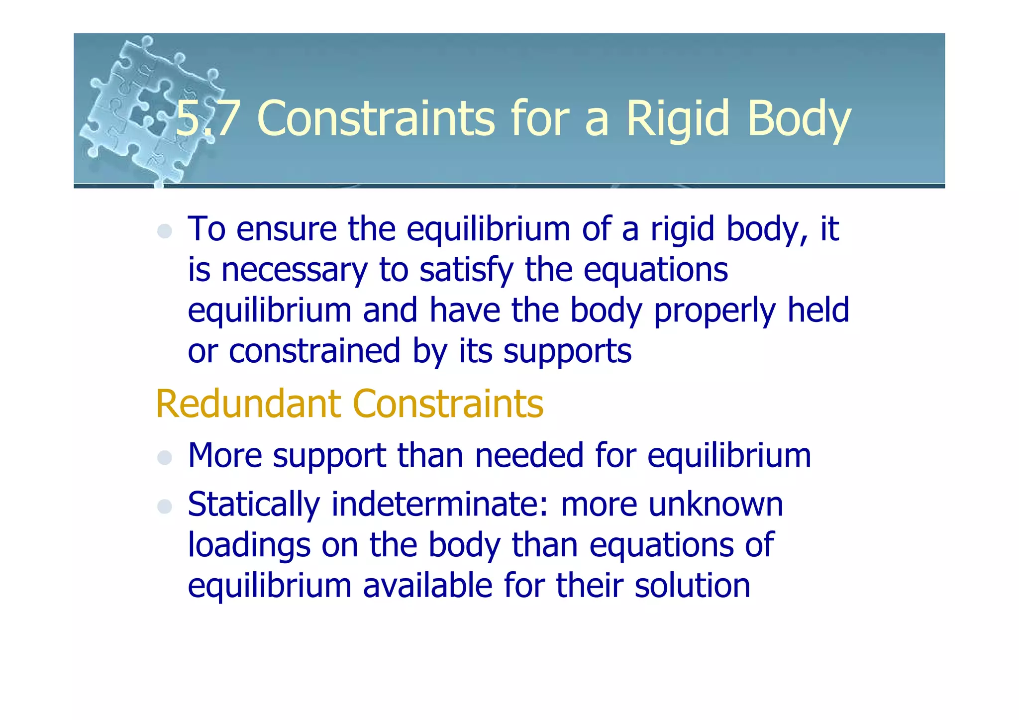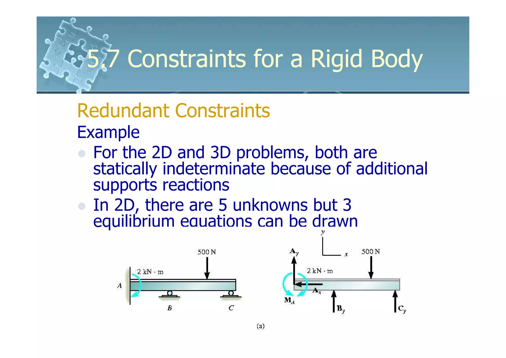 - Redundant constraints have more supports than needed for equilibrium, making problems statically indeterminate.