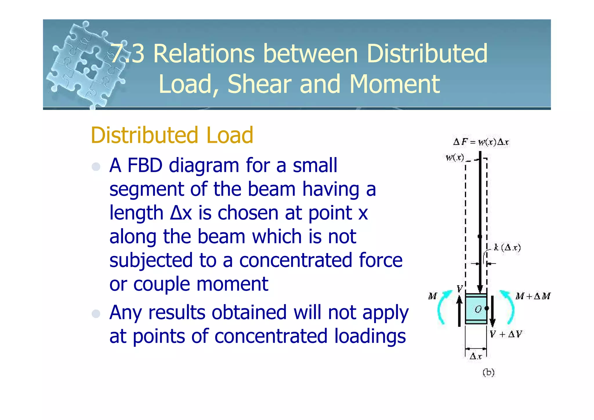 1) The document discusses the relationships between distributed loads, shear forces, and bending moments in beams.