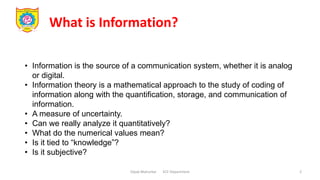 This document provides information on the topic of information sources and entropy from a lecture on discrete mathematics and information theory. It defines information and discusses how entropy can quantify the uncertainty or average information of a data source. Entropy is defined as the measure of average information per symbol of a data source. The document gives several examples of calculating the entropy of different data sources with varying symbol probabilities. It also discusses properties of entropy like how it relates to source efficiency and redundancy.
