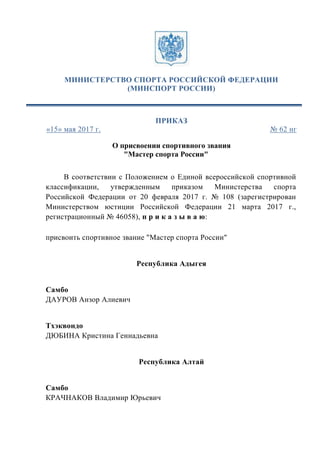 Приказ Министерства спорта Российской Федерации от 15 мая 2017 года № 62 нг присваивает спортивное звание "Мастер спорта России" различным спортсменам из разных регионов страны. В документе перечислены имена и виды спорта, в которых спортсмены добились значительных успехов. Это звание присваивается в соответствии с положением о единой всероссийской спортивной классификации.