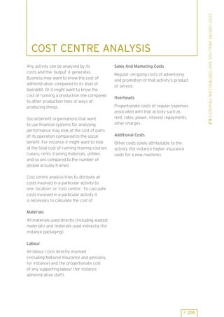 This document discusses cost centre analysis and controlling finances. It provides examples of analyzing costs for different activities, such as toy manufacturing and training delivery. For toy manufacturing, the total cost of producing toys is calculated to be £8,220. Toy production costs account for 34% of total costs. The total income from toy sales is £5,000. For training delivery, the total cost is calculated to be £6,000. The training officer would need to spend an additional 10% of her time training to cover full costs. Finding extra time could involve reducing administrative tasks or attending fewer meetings.