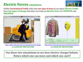 Electric fields arise from charged objects and can exert forces on other charged objects. There are two types of electric charge: positive and negative. Electric field lines show the direction that a positive test charge would move due to the electric field. Electric fields are generated by both positive and negative charges, and the strength of the electric field depends on the magnitude of the charges and the distance between them, as described by Coulomb's law. The electric field strength is defined as the force per unit charge exerted by the field on a small test charge placed within it.