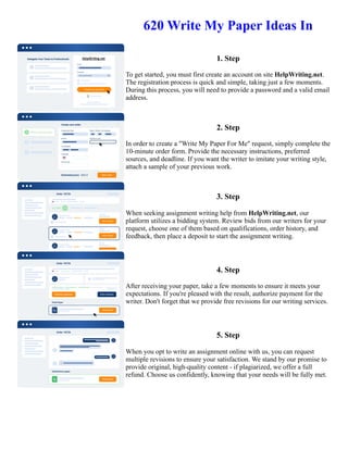 The document provides instructions for requesting and completing an assignment writing request through the website HelpWriting.net. It outlines a 5-step process: 1) Create an account with a password and email. 2) Complete a 10-minute order form providing instructions, sources, and deadline. 3) Review bids from writers and choose one. 4) Review the completed paper and authorize payment. 5) Request revisions to ensure satisfaction, with a refund offered for plagiarized work.