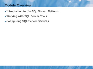 This document provides an overview of Module 1 which introduces SQL Server 2008 R2 and its toolset. It covers the SQL Server platform architecture, components, instances, and editions. It also discusses tools for working with SQL Server like SQL Server Management Studio, Business Intelligence Development Studio, and Books Online. Finally, it reviews configuring SQL Server services, network ports, server aliases, and tools like SQL Server Profiler. The module includes exercises and a lab scenario to configure a new SQL Server instance for a separate company using an existing server.